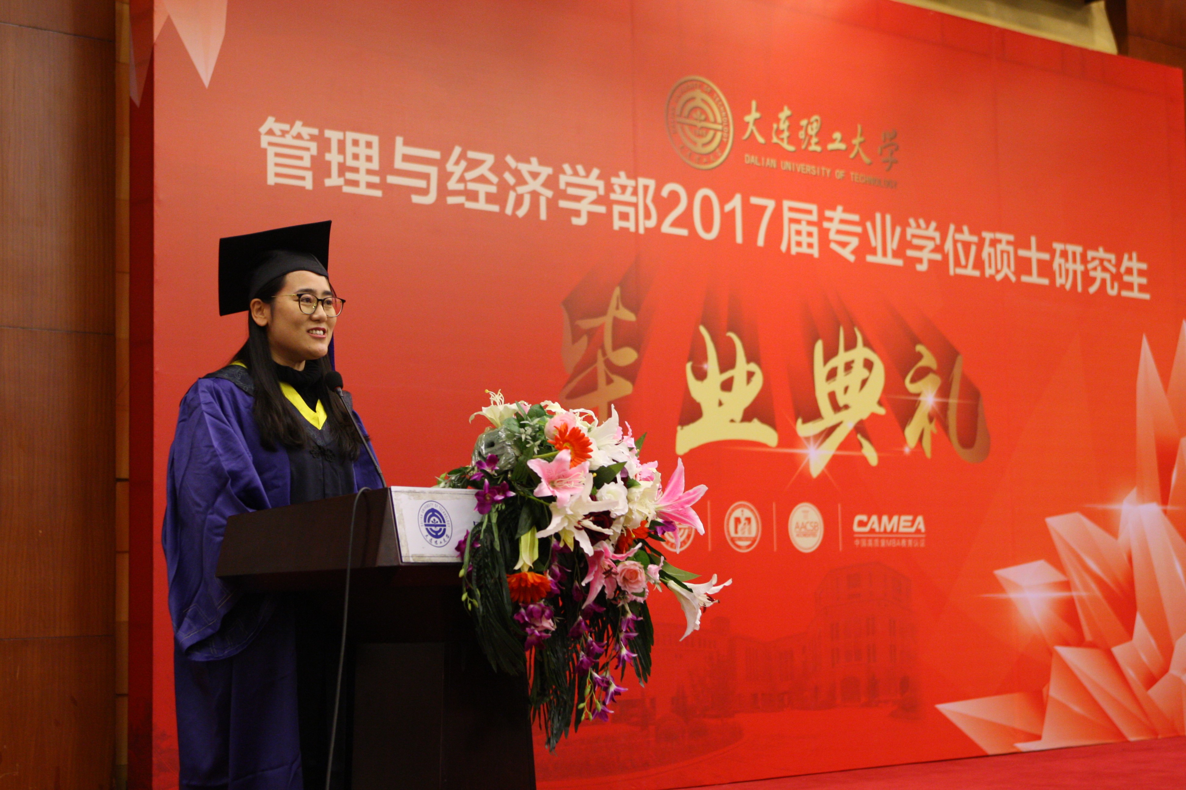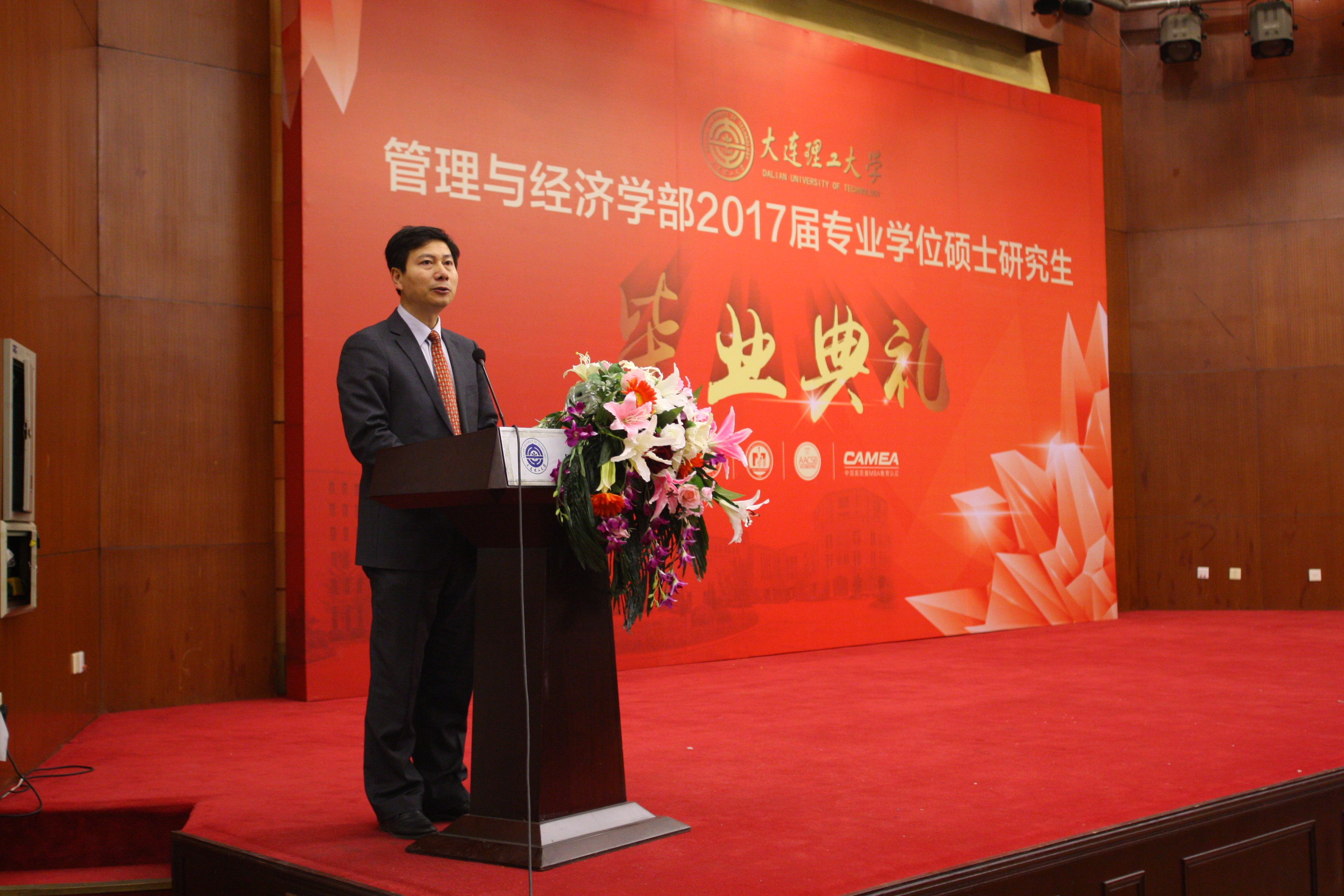 苏敬勤部长代表管理与经济学部致辞,他首先祝贺大家圆满完成学业,并回顾了两年间学部与同学们的共同进步,对老师及家属对同学们完成学业的支持表示了感谢。苏部长以振兴东北经济为主题寄语毕业生,希望同学们在今后的工作中运用所学的商科和管理类知识体系,为西方先进的管理理念与中国国情相融合做出自己的努力;希望同学们保持危机意识,积极投入社会变革中,致力于为东北经济复苏贡献自己的一份力量;希望同学们在今后的工作生活中,既能与母校分享成功的喜悦也能在遇到问题和困难时与我们探讨解决的办法,同学们与大工的亲情关系是牢固而不可割裂的,管经学部永远是同学们的坚强后盾。临别之际苏部长祝福大家为我们共同美好的未来而努力奋斗!