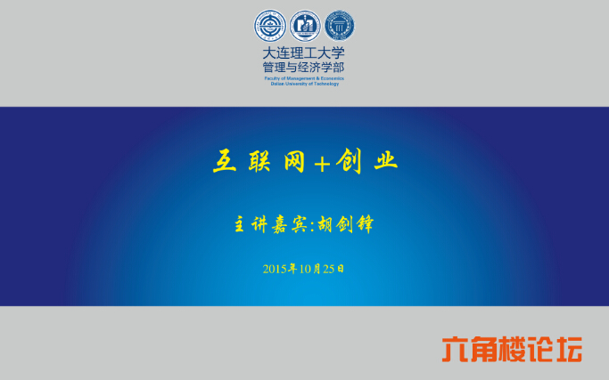 2015年10月25日,创新创业六角楼论坛第二讲迎来了大连高新区创业工坊掌舵人、校友胡剑锋为我们做了一场以“互联网+创业”为主题的论坛。