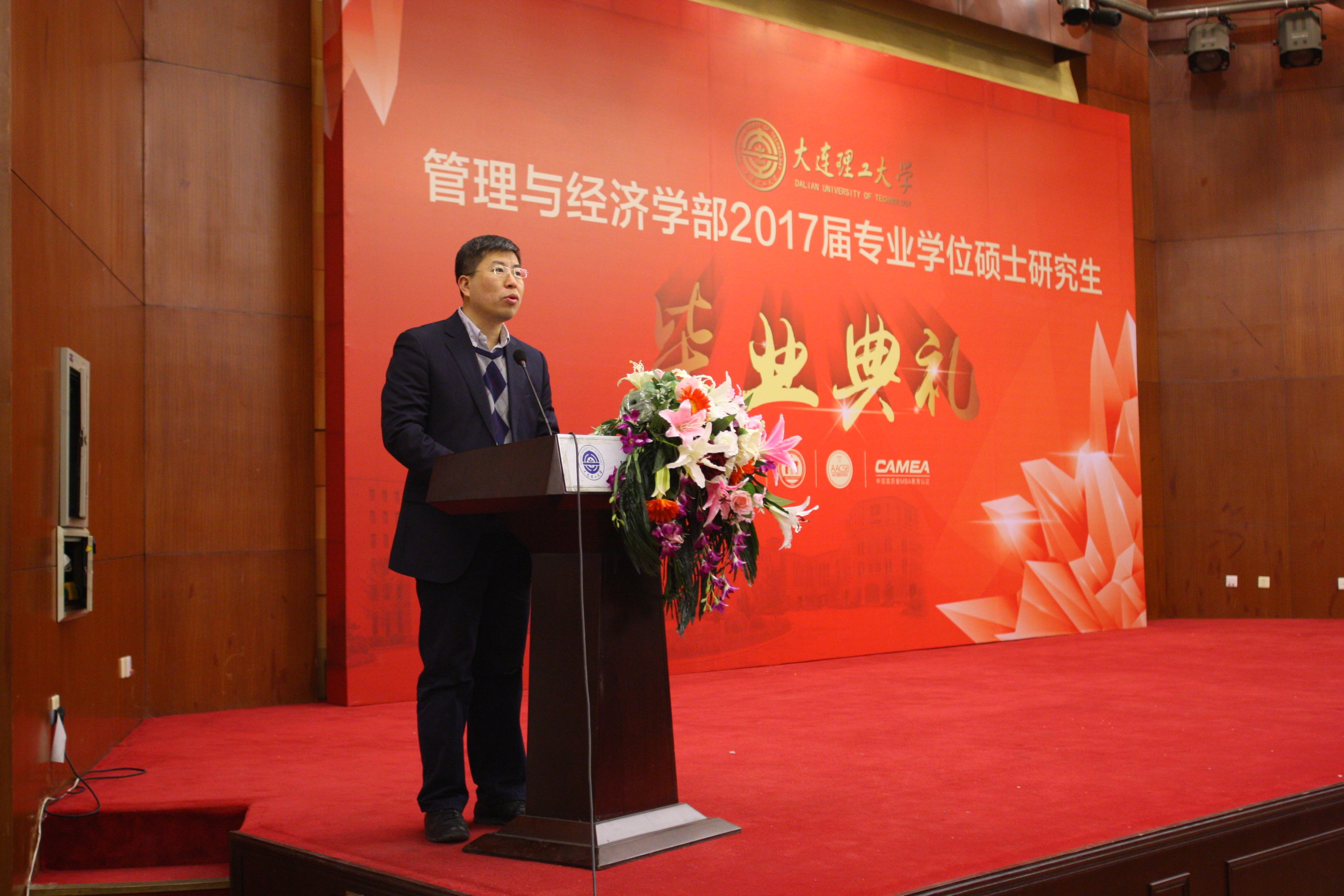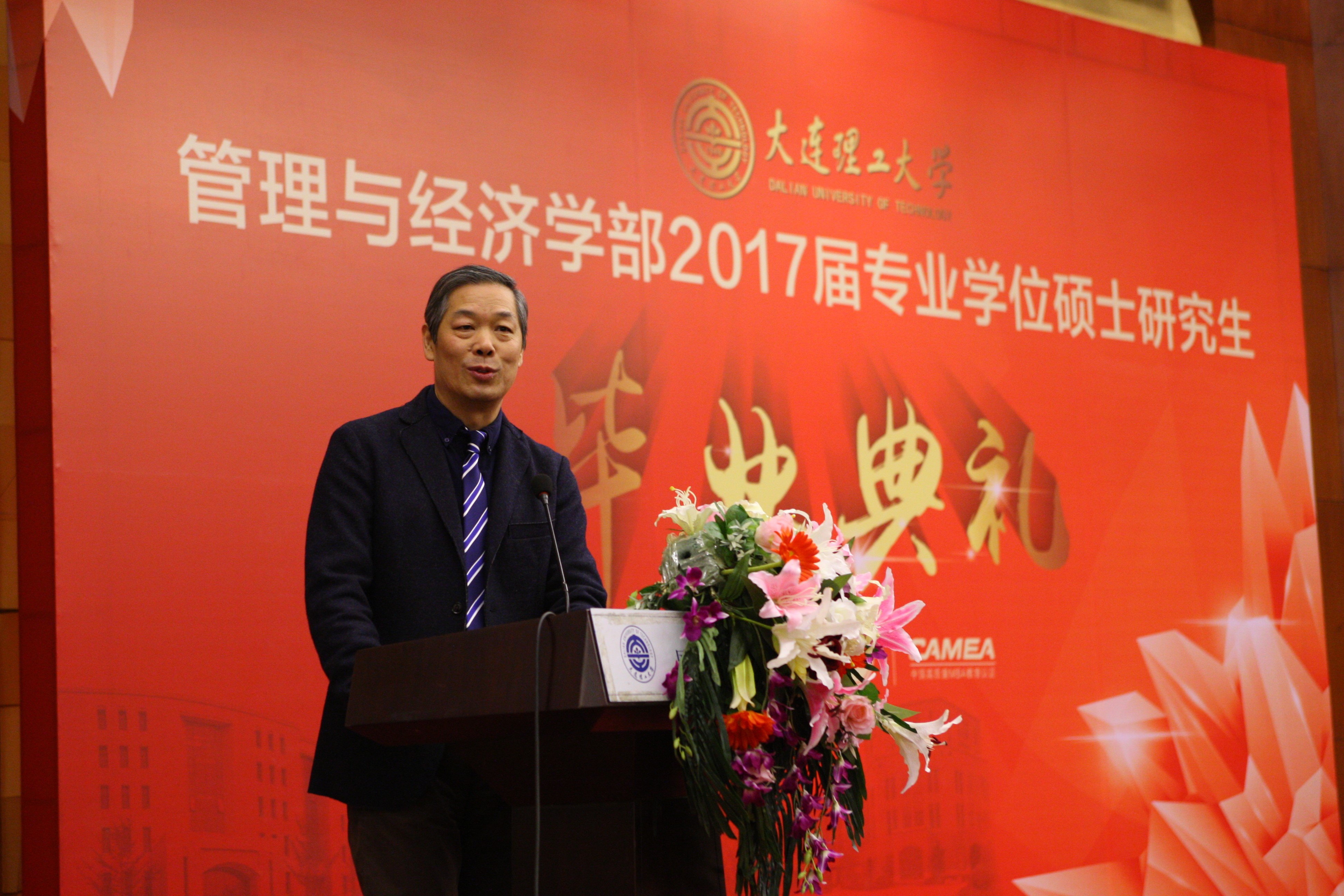 苏敬勤部长代表管理与经济学部致辞,他首先祝贺大家圆满完成学业,并回顾了两年间学部与同学们的共同进步,对老师及家属对同学们完成学业的支持表示了感谢。苏部长以振兴东北经济为主题寄语毕业生,希望同学们在今后的工作中运用所学的商科和管理类知识体系,为西方先进的管理理念与中国国情相融合做出自己的努力;希望同学们保持危机意识,积极投入社会变革中,致力于为东北经济复苏贡献自己的一份力量;希望同学们在今后的工作生活中,既能与母校分享成功的喜悦也能在遇到问题和困难时与我们探讨解决的办法,同学们与大工的亲情关系是牢固而不可割裂的,管经学部永远是同学们的坚强后盾。临别之际苏部长祝福大家为我们共同美好的未来而努力奋斗!