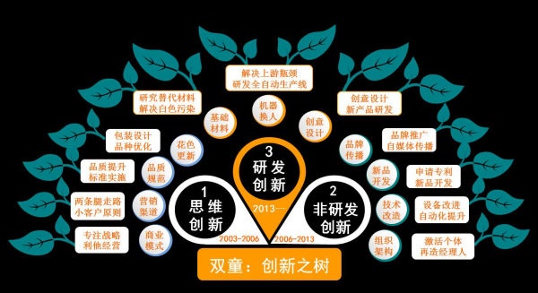 最后是双童的利他文化。孔子曰:“己欲立而立人,己欲达而达人”,个体想要发展,首先要站在利他的角度上。如BATJ(百度、阿里巴巴、腾讯、京东)最初只提供了一个平台,却以方便买卖双方或他人而获益。利他文化在双童的身上有很好的体现。一方面双童成全了员工,建立健全“家文化”生态环境,鼓励夫妻双方入厂工作;打造幸福企业,建立“五星级”工厂,为员工的生活条件投入;五年发展规划:助力员工不断“成长”。双童的一系列普惠员工政策,让员工有了更强的归属感。另一方面,双童的发展适应时代的发展趋势,双童历来重视环境保护工作,双童有雨水收集回用系统,可以提供双童70%的日常用水需求;双童有设备余热水循环利用系统,提供员工洗澡用水,消灭锅炉烧煤供水的污染;双童有废水处理回用系统,基本消灭了企业的废水排放和污染;双童还有垃圾分类利用循环系统,产生的垃圾70%得到分类、分拣、回收和循环利用;双童的办公楼顶是自建菜园,蔬菜自给自足,双童的产品也是环保的。这些得益于楼仲平董事长对“商”的辩证唯物观,他指出“商”的关系也包括人与自然的关系,企业的发展与楼仲平董事长的认知同步,协同发展。