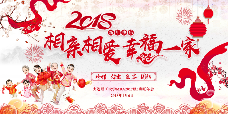 我不得不先说一下,映入眼帘地年会会场布置,温馨祥和。舞台正上方悬挂着本次年会的主题红色横幅—“相亲相爱,幸福一家”和银色气球组成的“2018 happy new year”,舞台左右两侧分别张挂着1703班特制的班旗,会场周边点缀着火红的“福”字和吉庆的“鱼”。